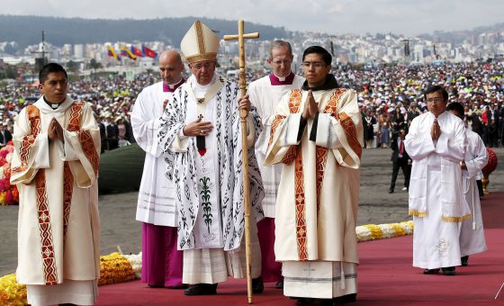 El Papa, que el lunes dijo misa en Guayaquil y por la tarde visitó a Correa en el palacio de Gobierno y saludó a los fieles congregados ante la catedral de Quito, construyó una hábil homilía que, sin salirse de lo canónico, también era una llamada a la revolución pacífica. "A aquel grito de libertad prorrumpido hace poco más de 200 años", explicó Bergoglio, "no le faltó convicción ni fuerza, pero la historia nos cuenta que solo fue contundente cuando dejó de lado los personalismos, el afán de liderazgos únicos, la falta de comprensión de otros procesos libertarios con características distintas pero no por eso antagónicos".
