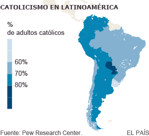 La Iglesia católica tiene las venas abiertas en América Latina. La región donde más fieles posee —425 millones— es también donde la sangría es mayor. Si, en 1970, el 97% de los latinoamericanos se consideraba católico, ahora solo lo es el 69%. Los protestantes, en cambio, han pasado del 4% al 19%, lo que significa que uno de cada cinco cristianos de la región frecuenta ya iglesias evangélicas. El Vaticano espera que el éxito religioso, político y mediático de la visita a Ecuador, Bolivia y Paraguay de Francisco —el primer papa latinoamericano— ayude a revertir esta tendencia.